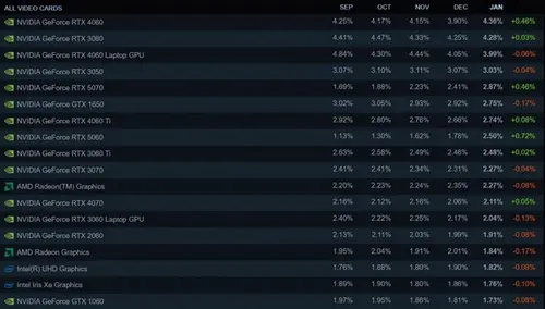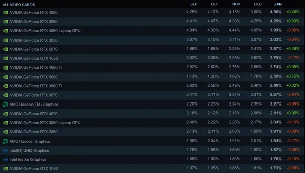 В категории видеокарт снова произошла смена лидера — GeForce RTX 4060 опередила RTX 3060 и вышла на первую строчку. Доля ускорителей составляет 4,16% и 4,11% соответственно. RTX 4060 Laptop замыкает топ-3 с долей 3,79%.