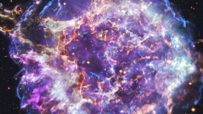 На фото остатков суперновы, чем, собственно, и является Кассиопея А, совмещены рентгеновские снимки "Чандры", данные группы радиотелескопов в США Сверхбольшая антенная решетка (темно-фиолетовый, голубой и белый), и результаты оптических наблюдений телескопа "Хаббл" (оранжевый цвет).