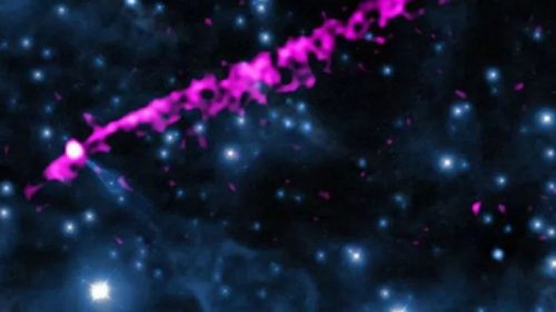 На этом снимке видны сразу два разных эффекта, производимых мертвой звездой PSR B2224+65. Розовый шлейф - это рентгеновское излучение, которое испускают полюса нейтронной звезды-пульсара. Источник излучения - ядро пульсара, сжавшееся в результате гравитационного коллапса.