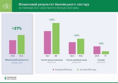 На 1 октября 2021 года из 71 платежеспособных банков 64 финучреждения были прибыльными и получили чистую прибыль 51,7 млрд грн. Это перекрыло убытки 7 банков на общую сумму 0,3 млрд. грн.
