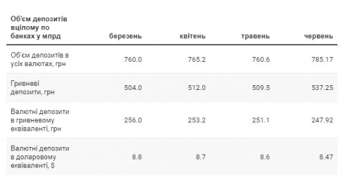 В июне, по данным НБУ, общий объем депозитного портфеля в целом по банковской системе вырос на 24,6 млрд грн. (3,2%) и составил 785,2 млрд грн.