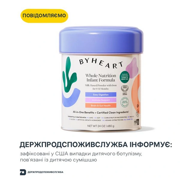 Зафиксированные в США случаи детского ботулизма связаны с детской смесью ByHeart Whole Nutrition. Об этом сообщила Государственная служба Украины по вопросам безопасности пищевых продуктов и защиты потребителей в пятницу, 21 ноября.