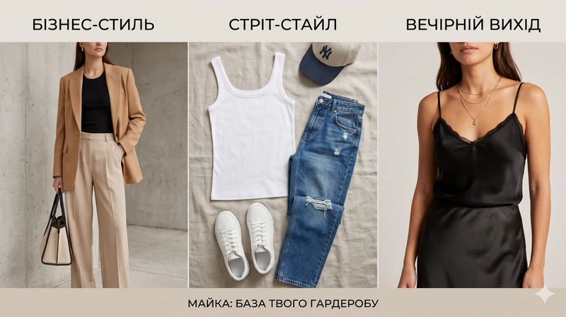 | Діловий та офісний стиль | Підійде лаконічна біла майка з щільної бавовни на широких бретелях. | Поєднуйте зі структурованим чоловічим жакетом та класичними брюками зі стрілками. |