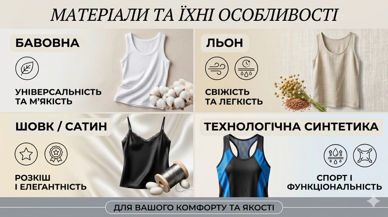 - Технологічна синтетика: суміш поліестеру та еластану використовується для спортивних моделей. Такі майки швидко відводять вологу і не втрачають форму після тренувань.